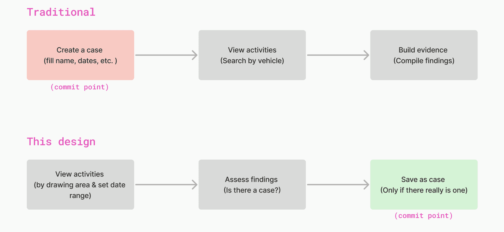 Moving the commit point from step 1 to step 3 removes the friction of starting a formal case before knowing if there's anything worth investigating.