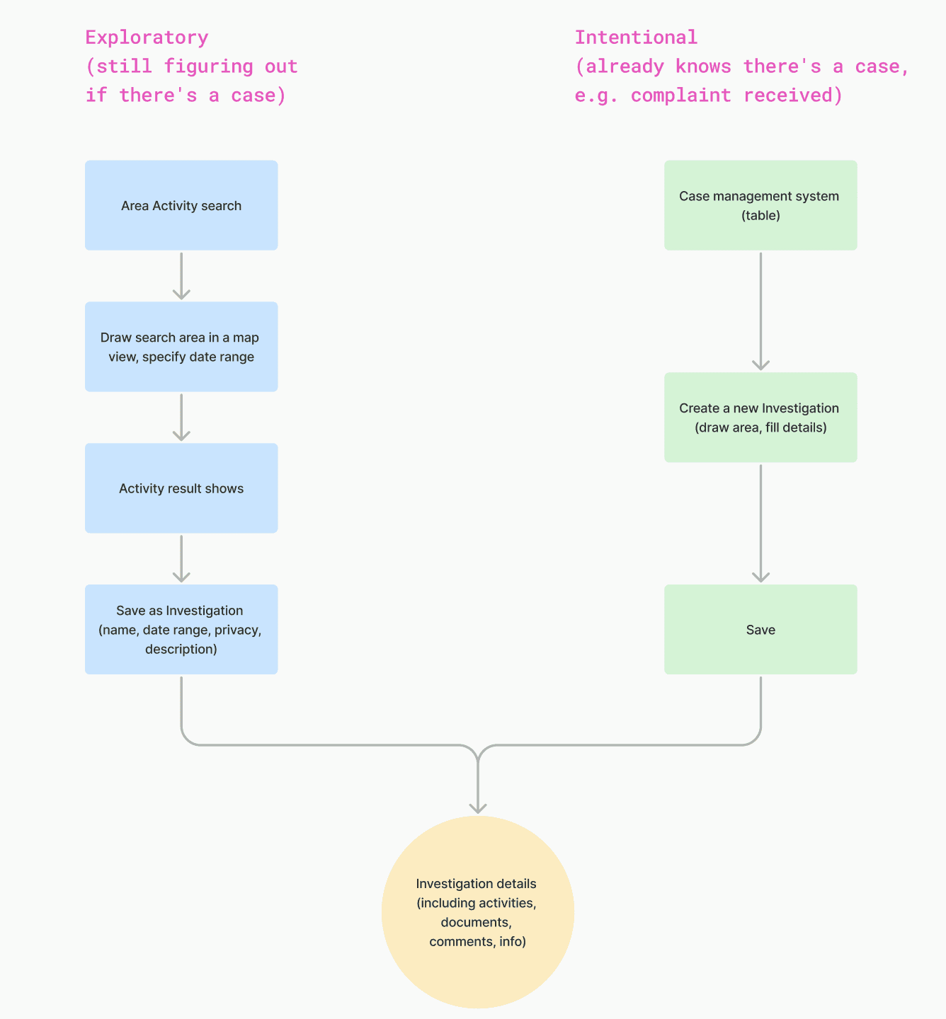 Entry from the map page to perform an Area Activity search (map → draw area → show activity → save as investigation) follows an exploration-driven path: users are not yet sure if there’s an issue, so they begin by looking at the data and only formalize an investigation if something stands out.