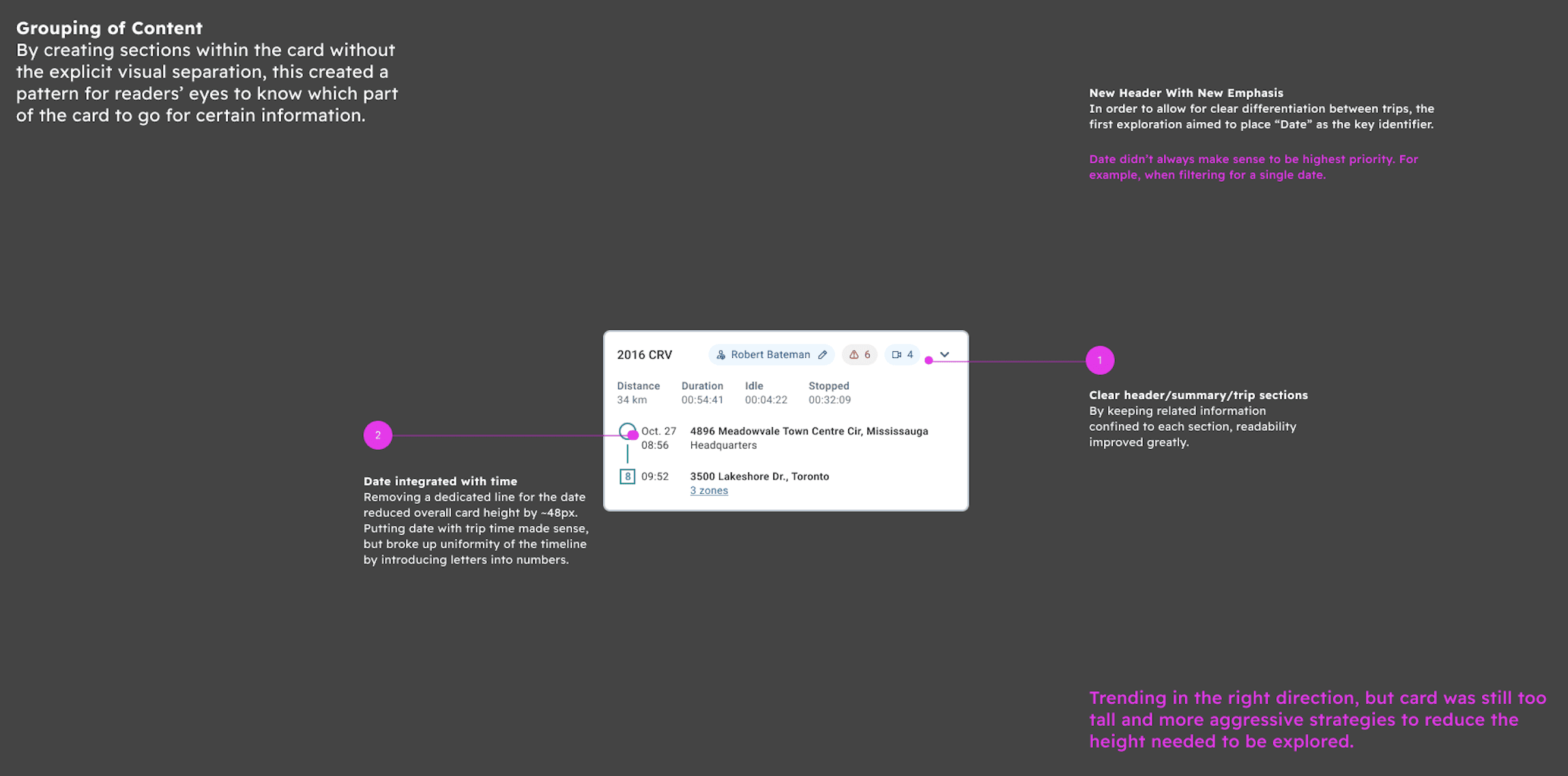 Product leadership also pushed back hard on this solution, with the primary reason being the experience still not simple enough, and the chunking of trips still being confusing. Additionally, since data density is a competitive advantage in the B2B fleet industry, the stakeholders mentioned: "We need the intuitive storytelling of the new timeline, but we cannot sacrifice the data density - we need to fit more trips in the vertical space to avoid excessive scrolling."