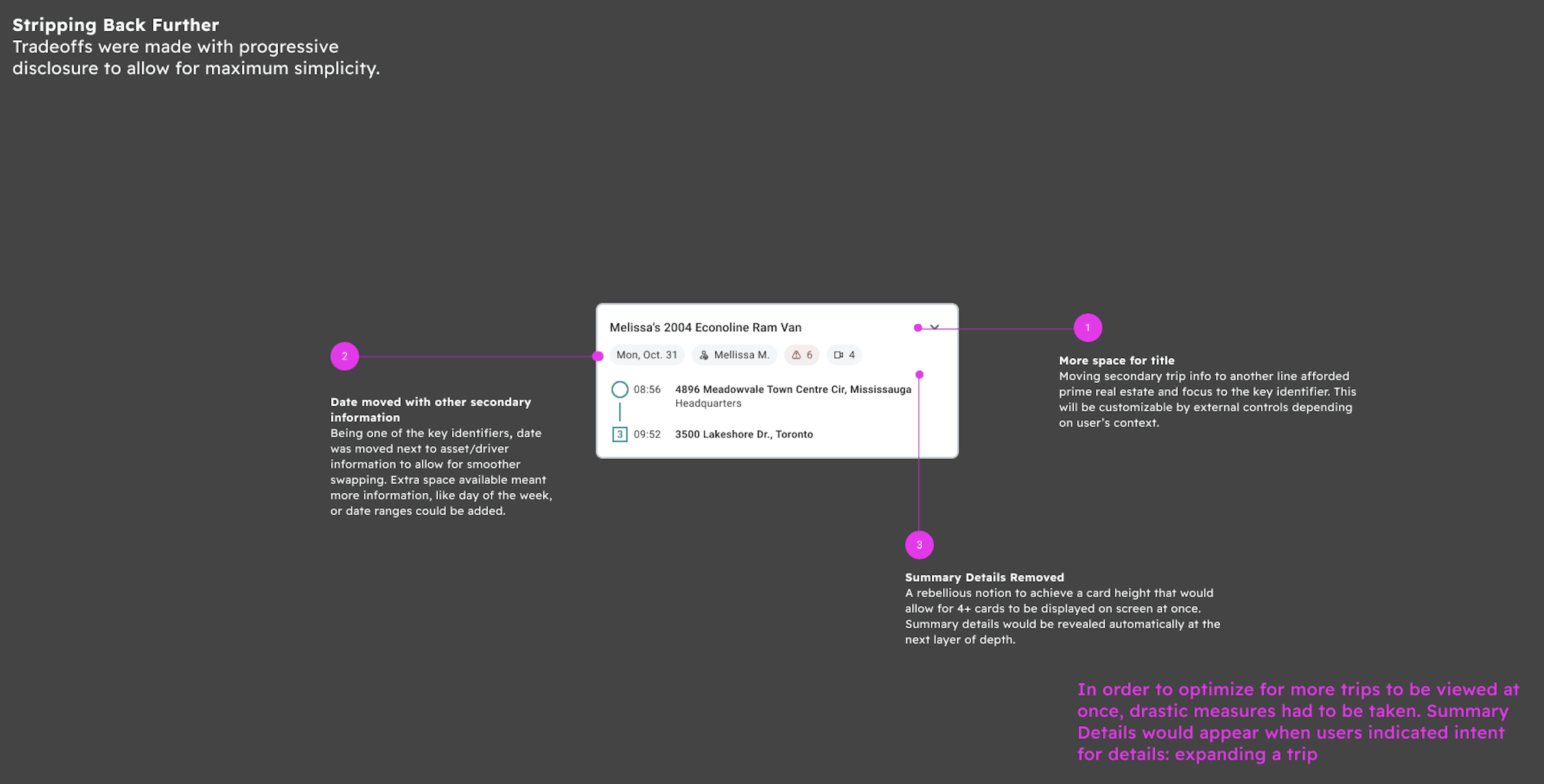 To solve the problems, I proposed to apply progressive disclosure to show a summary of each trip at a high level, and reveal additional information when the user chooses to. Hiding some information would reduce clutter and decrease the cognitive load. I also proposed a radical shift in the information architecture: moving from a flat, horizontal data dump to a chronological, card-based timeline:
