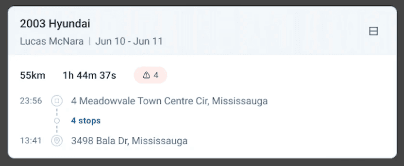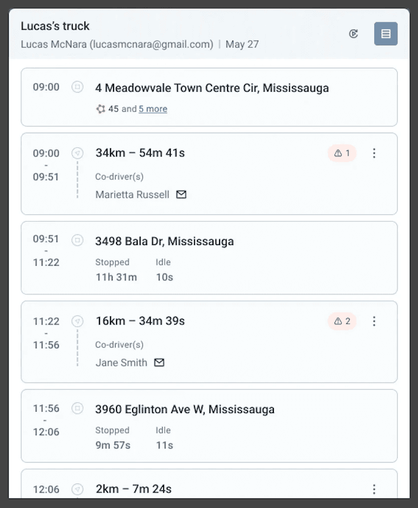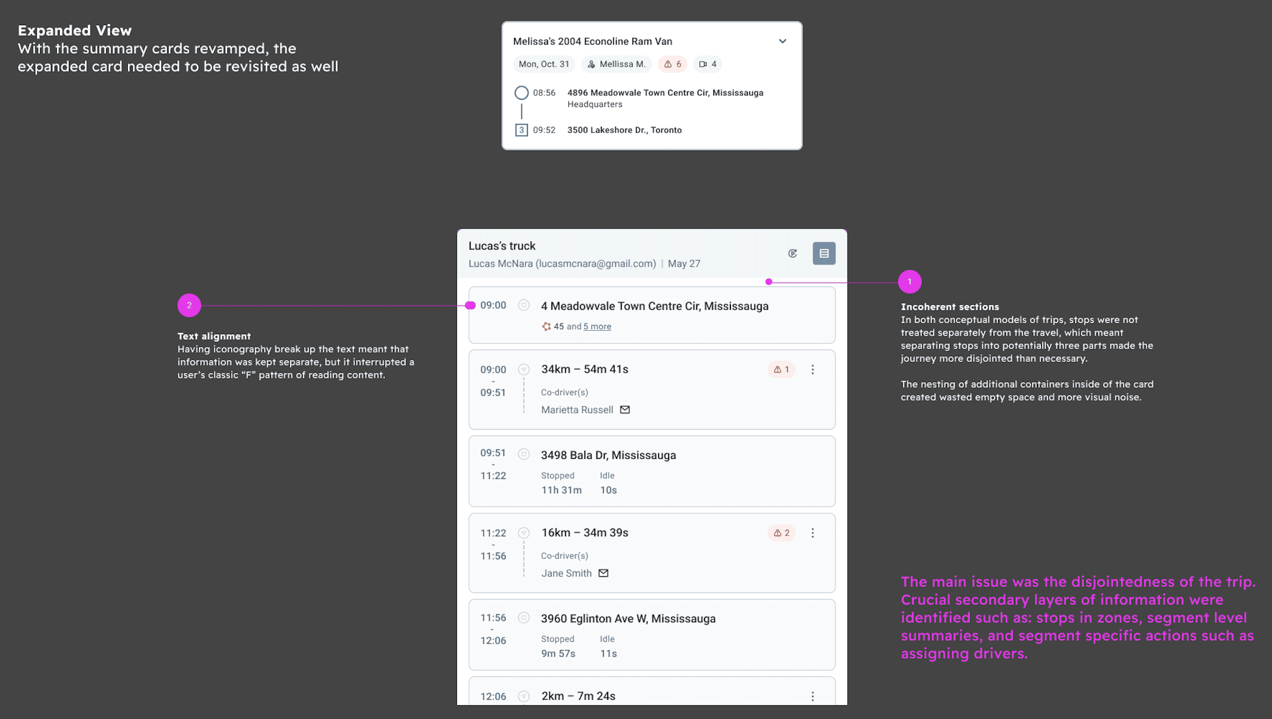 The logical mental model of a trip should be related to time and sequence: starting from Point A, drove to Point B. With this in mind, I transformed the clunky table of disconnected records into a vertical chronological timeline, and decoupled "Driving" segments from "Stopped" segments into distinct blocks. This allowed me to group relevant data contextually: driving blocks show distance, duration, co-drivers, and in-transit alerts; stopped blocks show location addresses, stop duration and idling time. This structure eliminated the awkward horizontal blank spaces of the legacy design and created a natural, top-to-bottom reading flow.