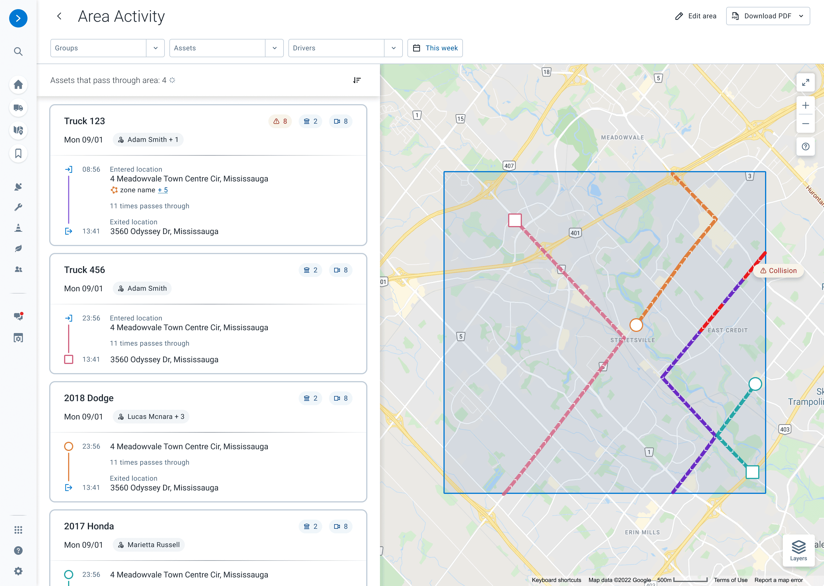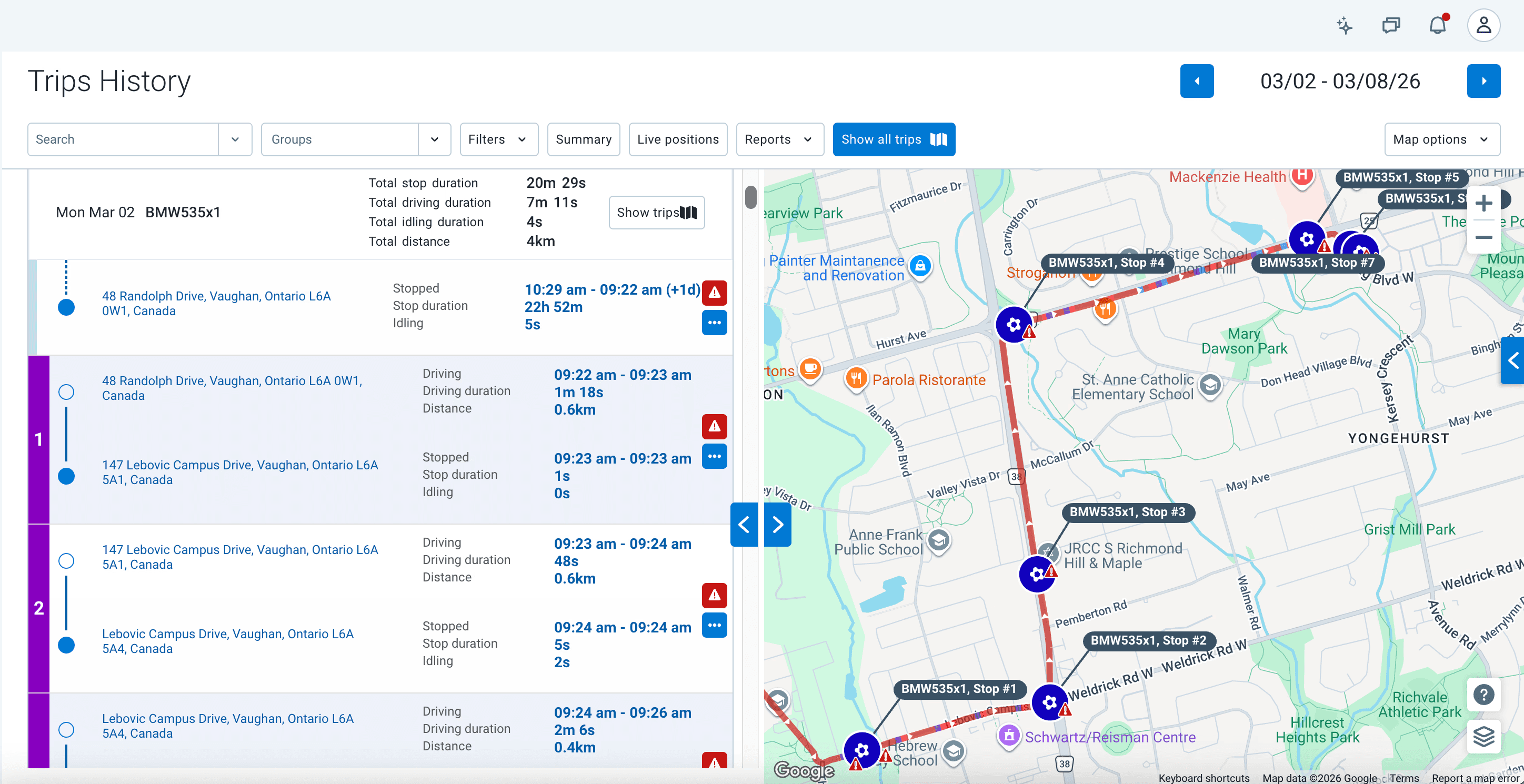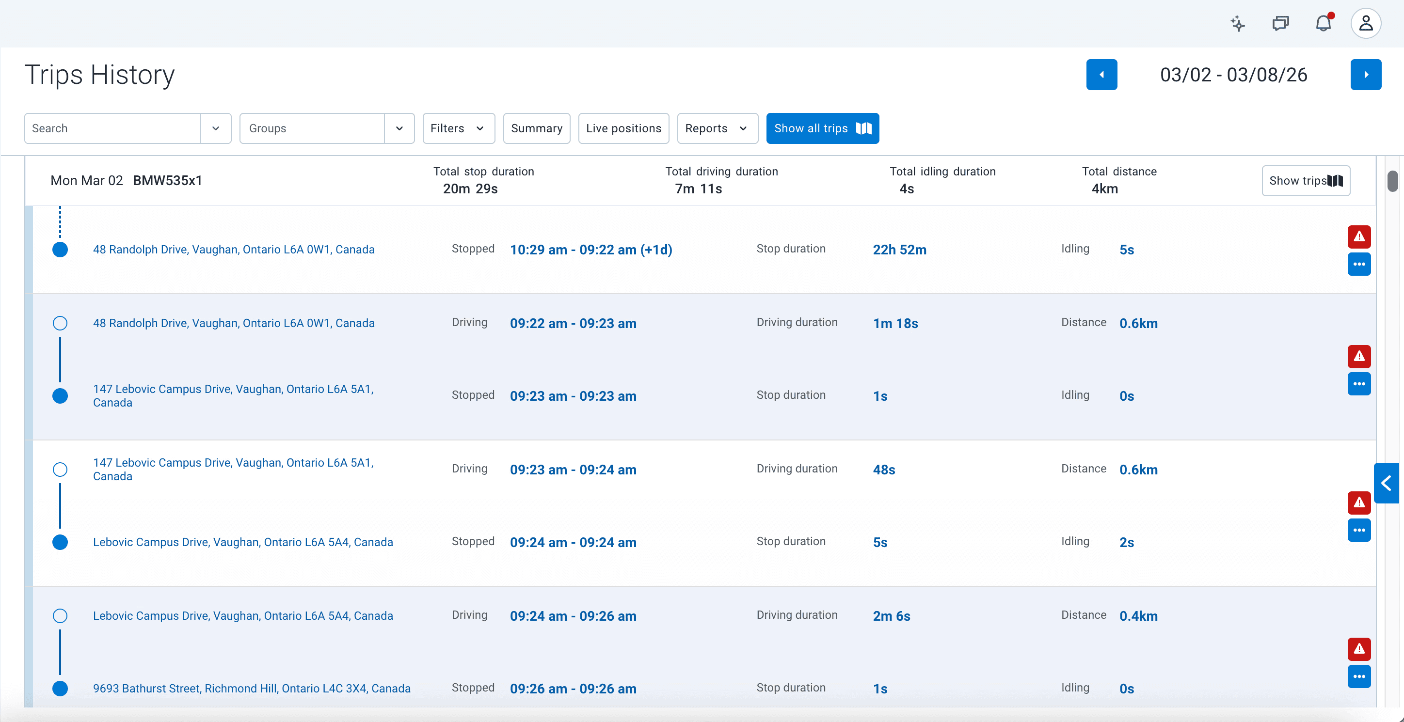 It is difficult to immediately grasp the parent-child relationship of the data. The asset name in the header is somewhat lost above the list rows. It takes a moment to realize that all the subsequent rows are stops and drives belonging to that specific vehicle on that specific day.