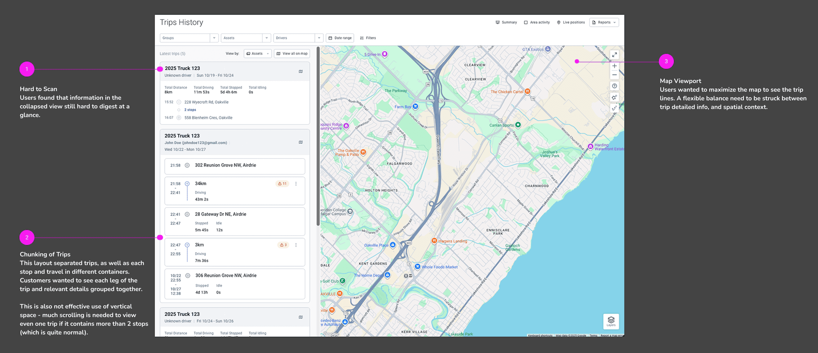 Trips History was one of the core features of our customer-facing fleet management platform, but the current usability was rated one of the worst among all features in the product, with only a 58% score from our UMUX survey. This was a risk for us as low customer satisfaction will lead to lost of trust, competitiveness over our competitors, and revenue retention.
