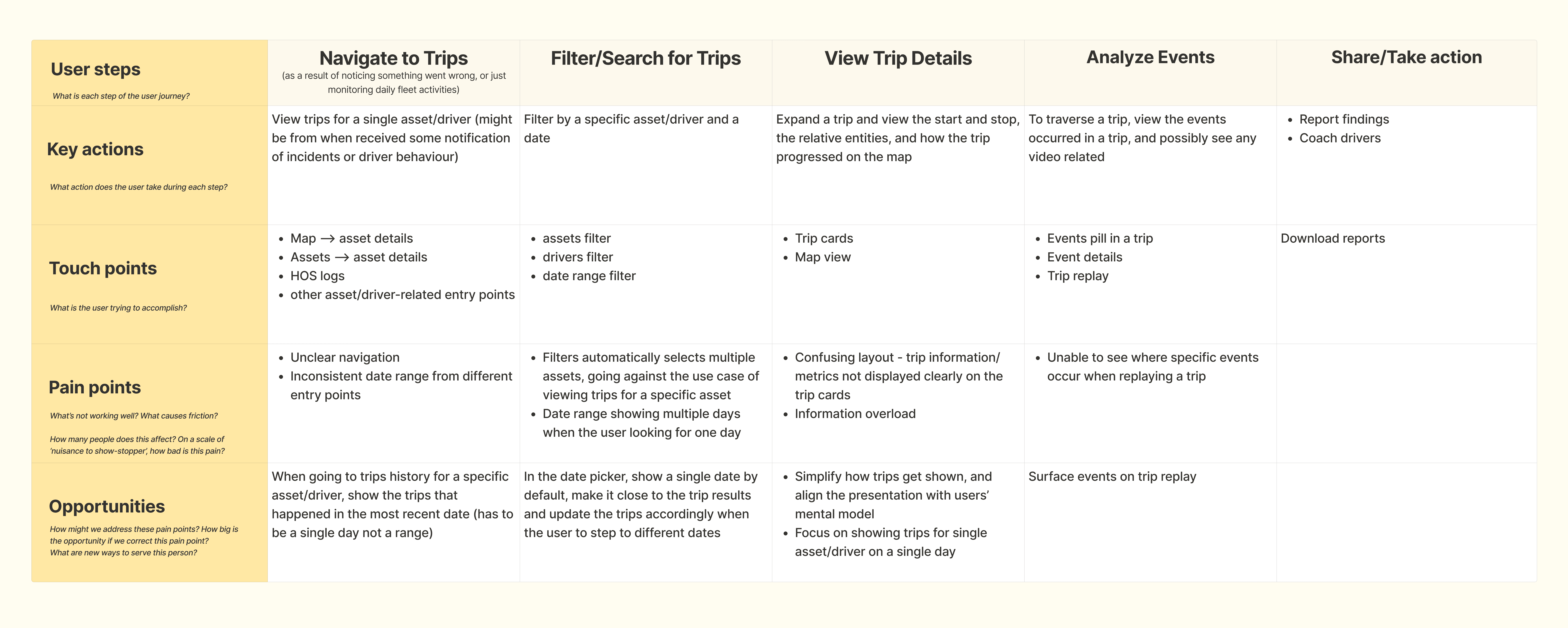 To keep raising the bar, I needed to find a way to merge the chronological clarity of the trip cards with the high data density of a traditional data table. Instead of applying band-aid fixes, I took a step back to restructure the underlying information architecture. Based on all the feedback received, I mapped out a user journey for the current experience, so that the pain points and opportunity of improvements became clear: